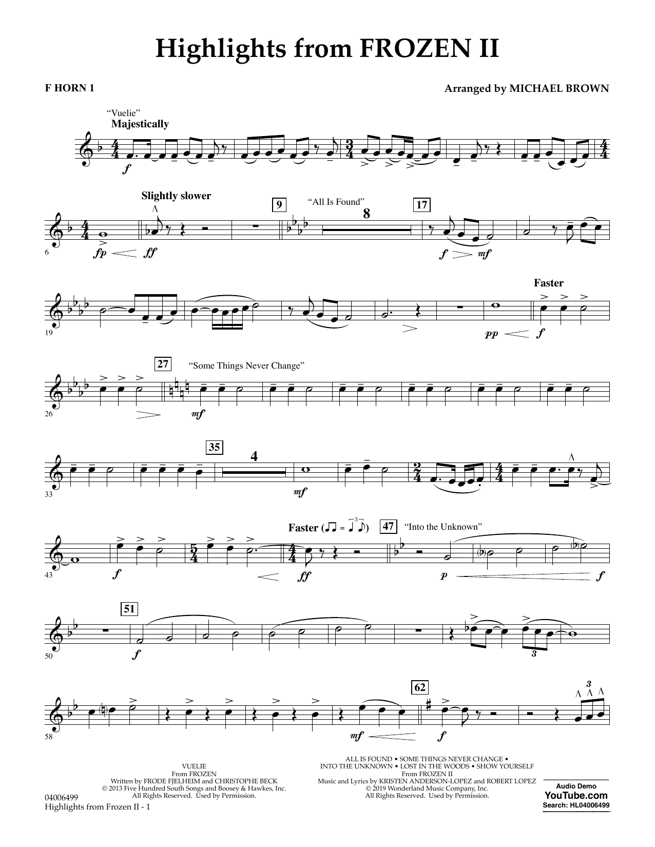 Quick facts Highlights from Disney's Frozen 2 (arr. Michael Brown) - F Horn 1 about digital sheet music