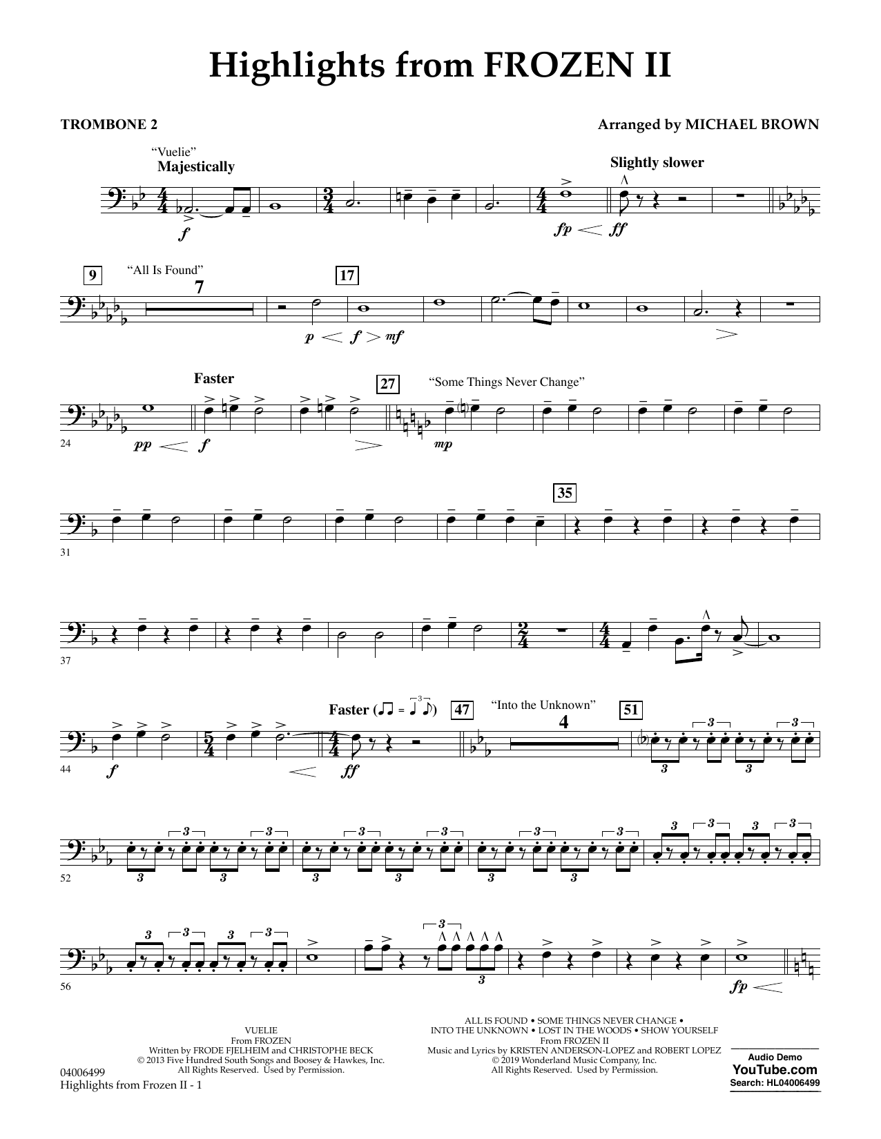 Download or print Kristen Anderson-Lopez & Robert Lopez Highlights from Disney's Frozen 2 (arr. Michael Brown) - Trombone 2 sheet music, chords and digital score arranged for Concert Band. This Disney score includes 2 page(s).