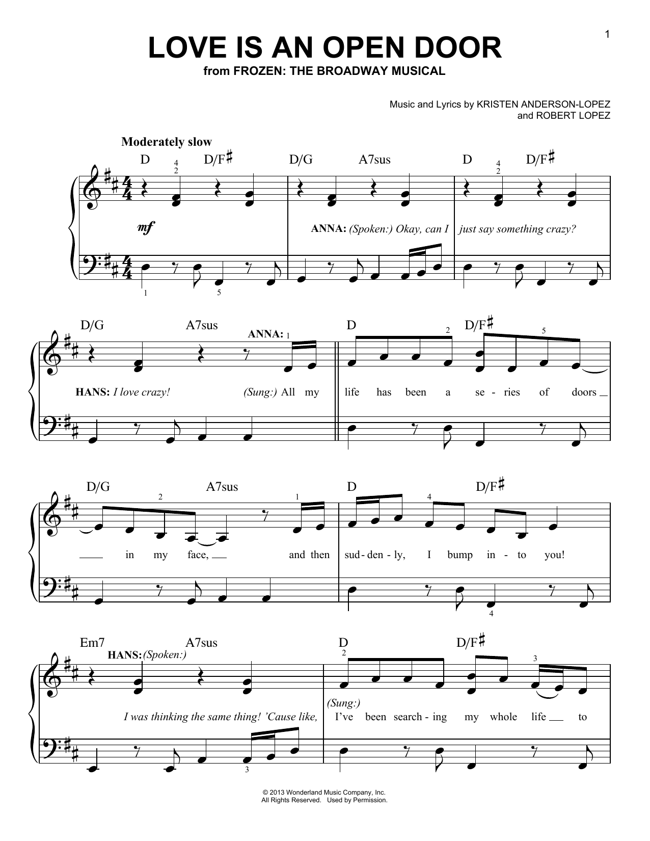 Download or print Kristen Anderson-Lopez & Robert Lopez Love Is An Open Door (from Frozen: The Broadway Musical) sheet music, chords and digital score arranged for Piano & Vocal. This Disney score includes 7 page(s).