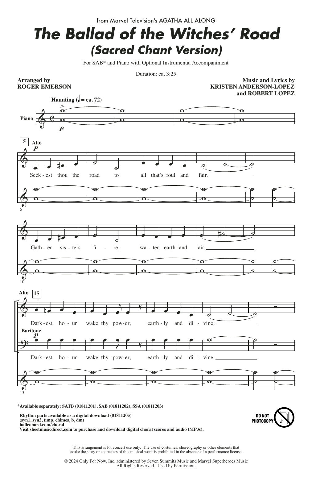 Download or print Kristen Anderson-Lopez & Robert Lopez The Ballad Of The Witches' Road (Sacred Chant Version) (arr. Roger Emerson) sheet music, chords and digital score arranged for SSA Choir. This Disney score includes 11 page(s).