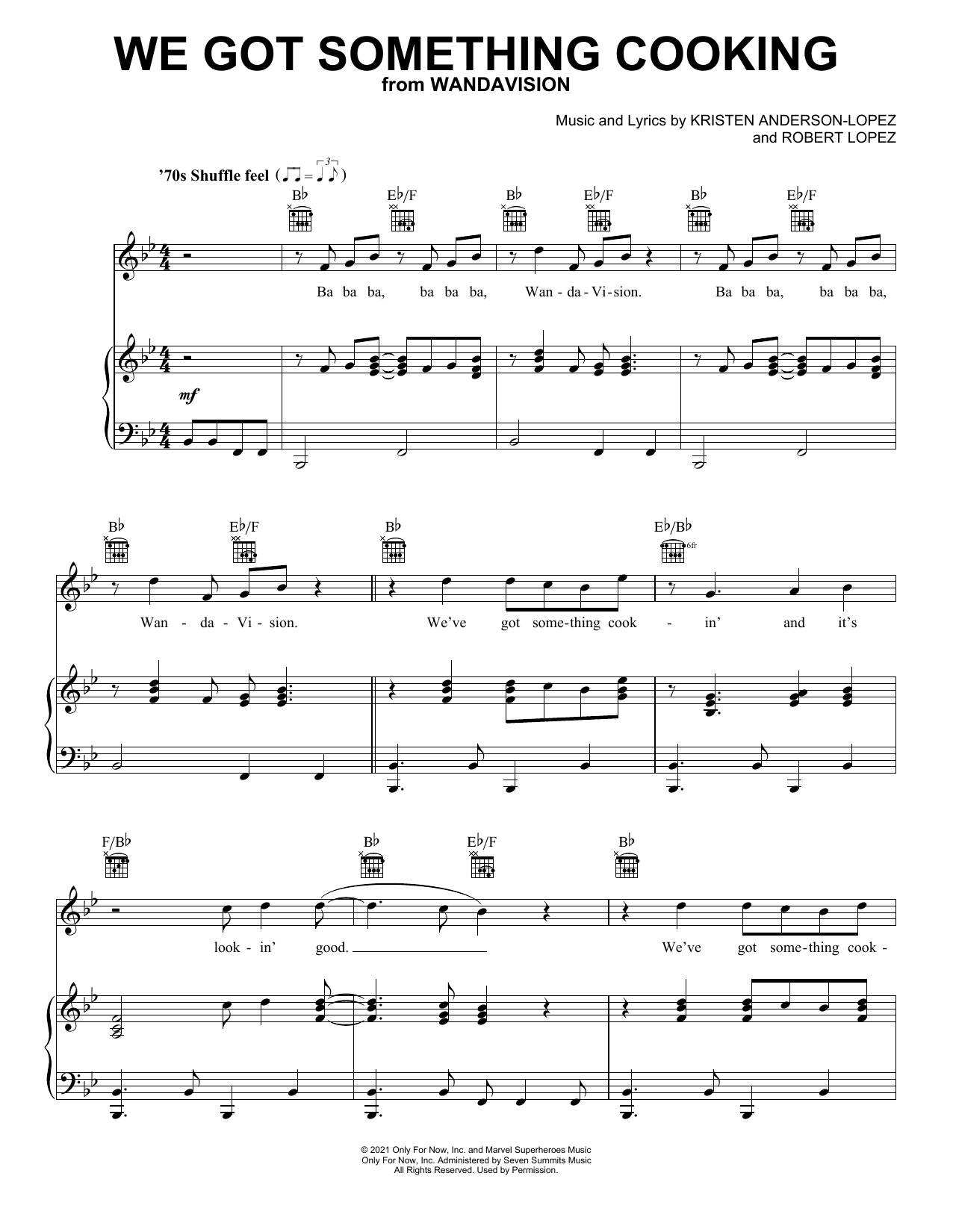 Download or print Kristen Anderson-Lopez & Robert Lopez We Got Something Cookin' (from WandaVision) sheet music, chords and digital score arranged for Piano, Vocal & Guitar Chords (Right-Hand Melody). This Disney score includes 3 page(s).