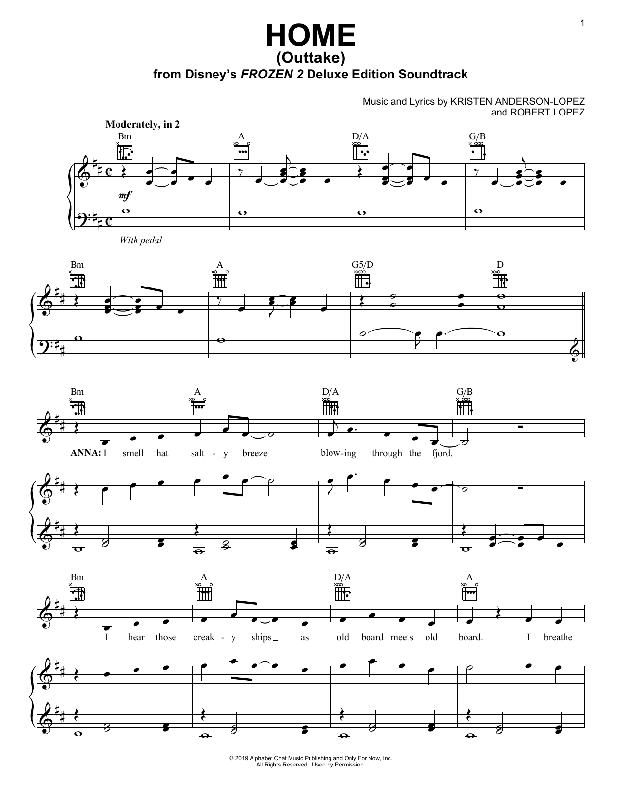 Download or print Kristen Bell Home - Outtake (from Disney's Frozen 2) sheet music, chords and digital score arranged for Piano, Vocal & Guitar Chords (Right-Hand Melody). This Disney score includes 8 page(s).
