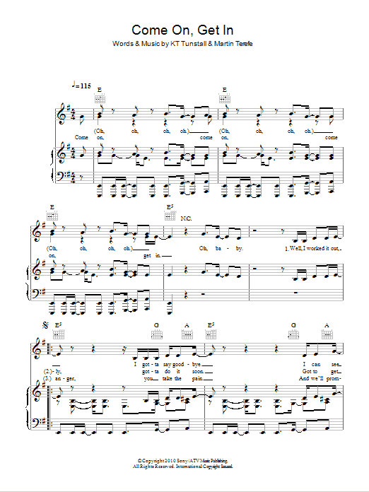 Download or print KT Tunstall Come On, Get In sheet music, chords and digital score arranged for Piano, Vocal & Guitar Chords. This Pop score includes 7 page(s).