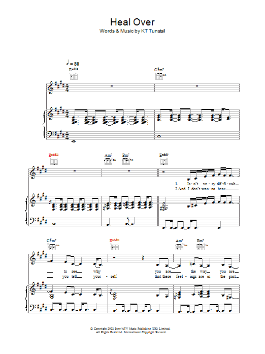 Download or print KT Tunstall Heal Over sheet music, chords and digital score arranged for Piano, Vocal & Guitar Chords. This Pop score includes 5 page(s).