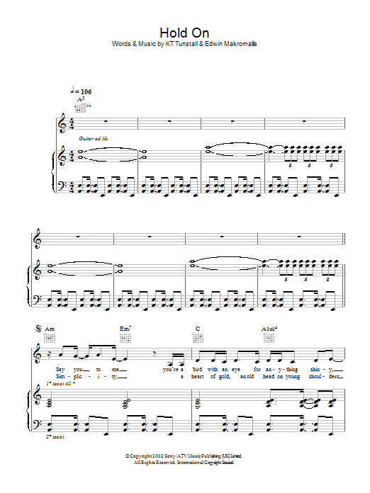 Download or print KT Tunstall Hold On sheet music, chords and digital score arranged for Lead Sheet / Fake Book. This Pop score includes 4 page(s).