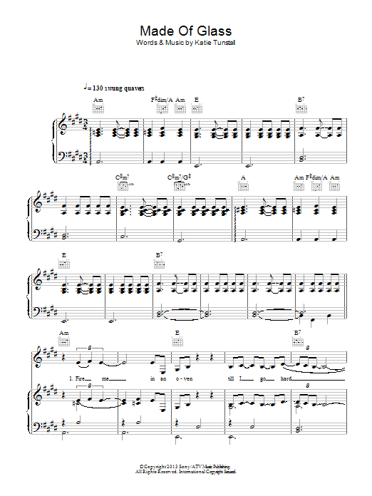 Download or print KT Tunstall Made Of Glass sheet music, chords and digital score arranged for Piano, Vocal & Guitar Chords. This Pop score includes 8 page(s).