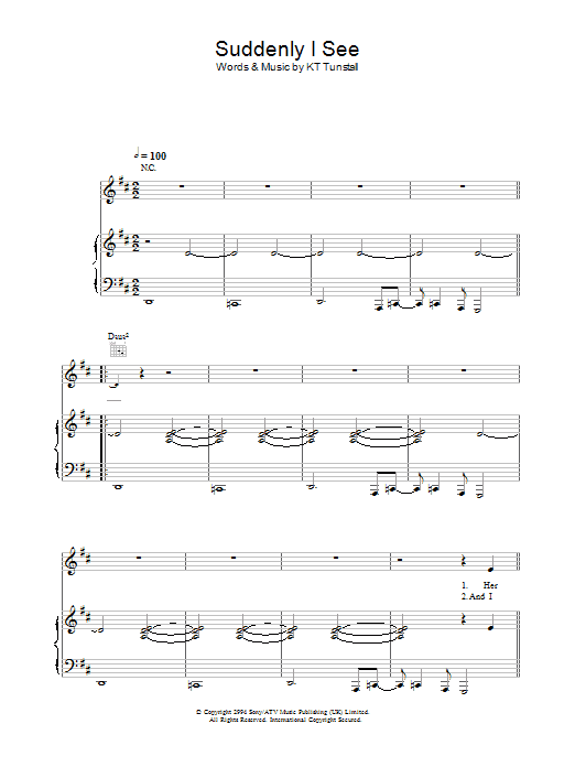 Download or print KT Tunstall Suddenly I See sheet music, chords and digital score arranged for Guitar Chords/Lyrics. This Rock score includes 3 page(s).
