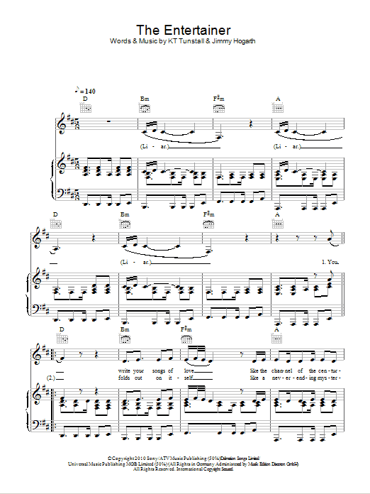 Download or print KT Tunstall The Entertainer sheet music, chords and digital score arranged for Piano, Vocal & Guitar Chords. This Pop score includes 6 page(s).
