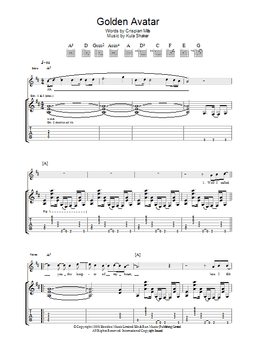 Download or print Kula Shaker Golden Avatar sheet music, chords and digital score arranged for Guitar Tab. This Pop score includes 9 page(s).