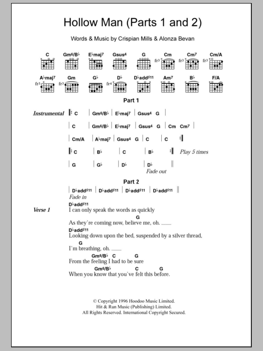Download or print Kula Shaker Hollow Man (Parts 1 and 2) sheet music, chords and digital score arranged for Guitar Chords/Lyrics. This Rock score includes 2 page(s).