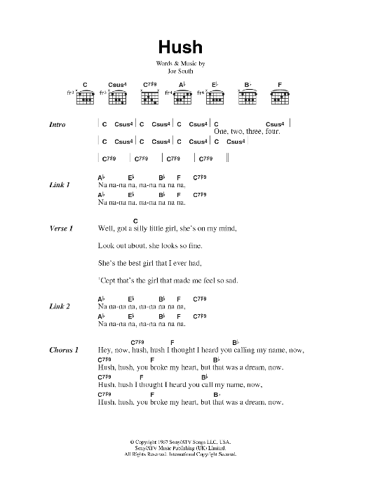 Download or print Kula Shaker Hush sheet music, chords and digital score arranged for Guitar Chords/Lyrics. This Rock score includes 2 page(s).