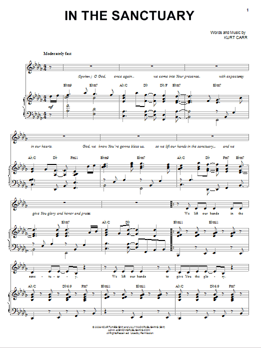 Download or print Kurt Carr In The Sanctuary sheet music, chords and digital score arranged for Piano & Vocal. This Christian score includes 12 page(s).