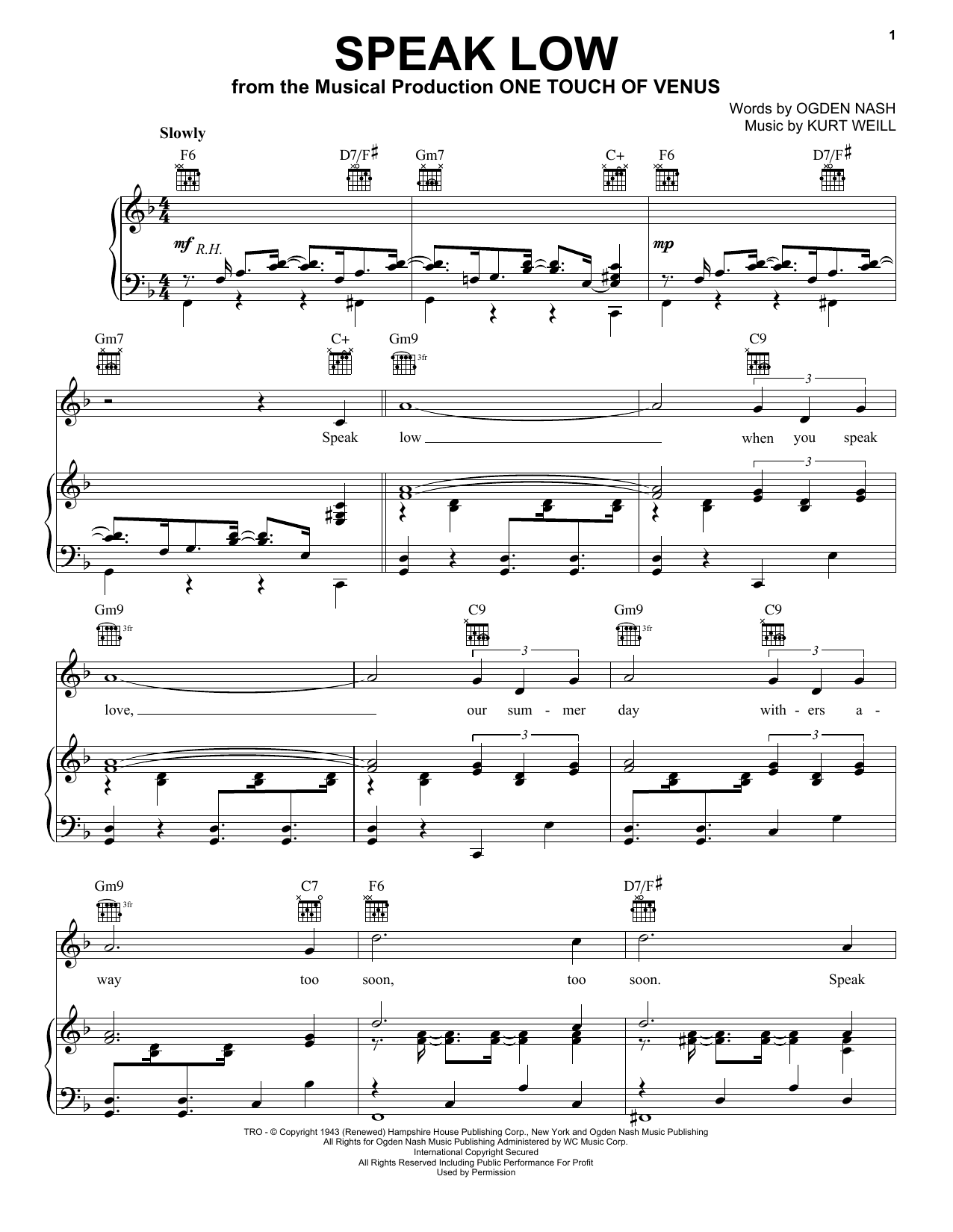 Download or print Kurt Weill Speak Low sheet music, chords and digital score arranged for Ukulele Chords/Lyrics. This Standards score includes 2 page(s).