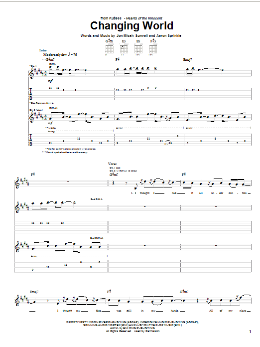 Download or print Kutless Changing World sheet music, chords and digital score arranged for Guitar Tab. This Christian score includes 5 page(s).