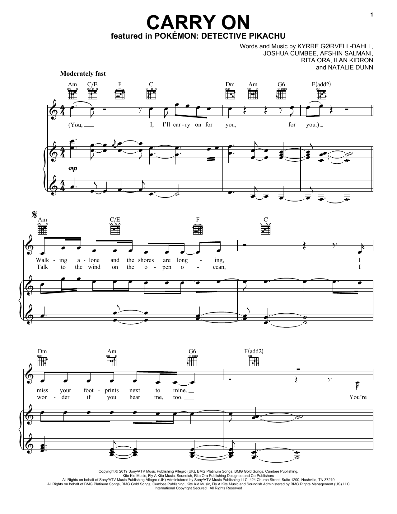 Download or print Kygo & Rita Ora Carry On (from Pokémon Detective Pikachu) sheet music, chords and digital score arranged for Piano, Vocal & Guitar Chords (Right-Hand Melody). This Film/TV score includes 8 page(s).