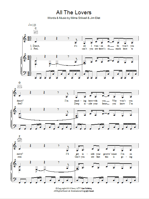 Download or print Kylie All The Lovers sheet music, chords and digital score arranged for Piano, Vocal & Guitar Chords. This Pop score includes 8 page(s).