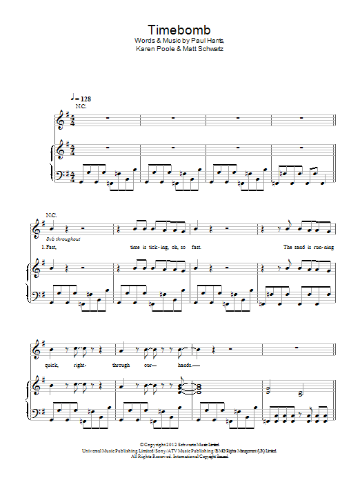 Download or print Kylie Minogue Timebomb sheet music, chords and digital score arranged for Piano, Vocal & Guitar Chords. This Pop score includes 7 page(s).