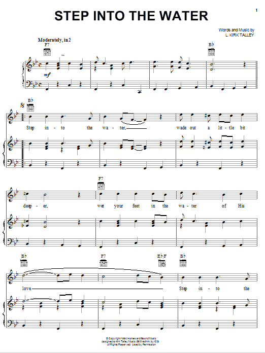Download or print L. Kirk Talley Step Into The Water sheet music, chords and digital score arranged for Piano, Vocal & Guitar Chords (Right-Hand Melody). This Christian score includes 3 page(s).
