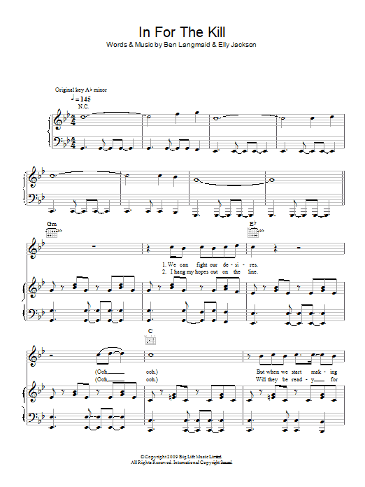 Download or print La Roux In For The Kill sheet music, chords and digital score arranged for Piano Chords/Lyrics. This Pop score includes 2 page(s).