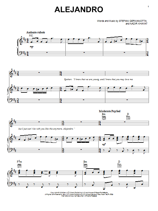 Download or print Lady Gaga Alejandro sheet music, chords and digital score arranged for Piano Solo. This Pop score includes 4 page(s).