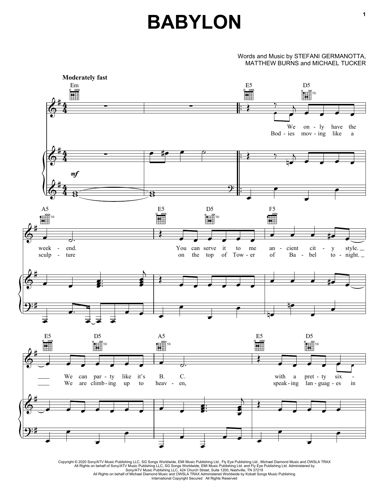 Download or print Lady Gaga Babylon sheet music, chords and digital score arranged for Piano, Vocal & Guitar Chords (Right-Hand Melody). This Pop score includes 5 page(s).