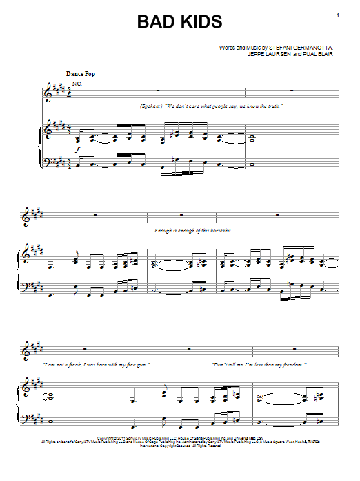 Download or print Lady Gaga Bad Kids sheet music, chords and digital score arranged for Piano, Vocal & Guitar Chords (Right-Hand Melody). This Pop score includes 8 page(s).