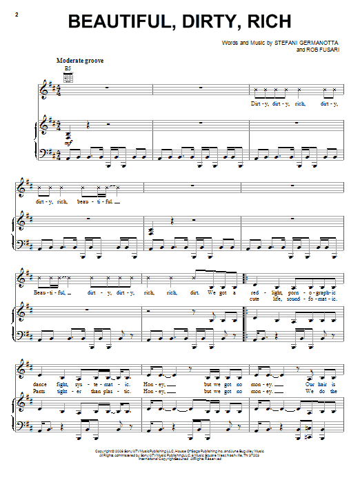 Download or print Lady Gaga Beautiful, Dirty, Rich sheet music, chords and digital score arranged for Piano, Vocal & Guitar Chords (Right-Hand Melody). This Pop score includes 4 page(s).