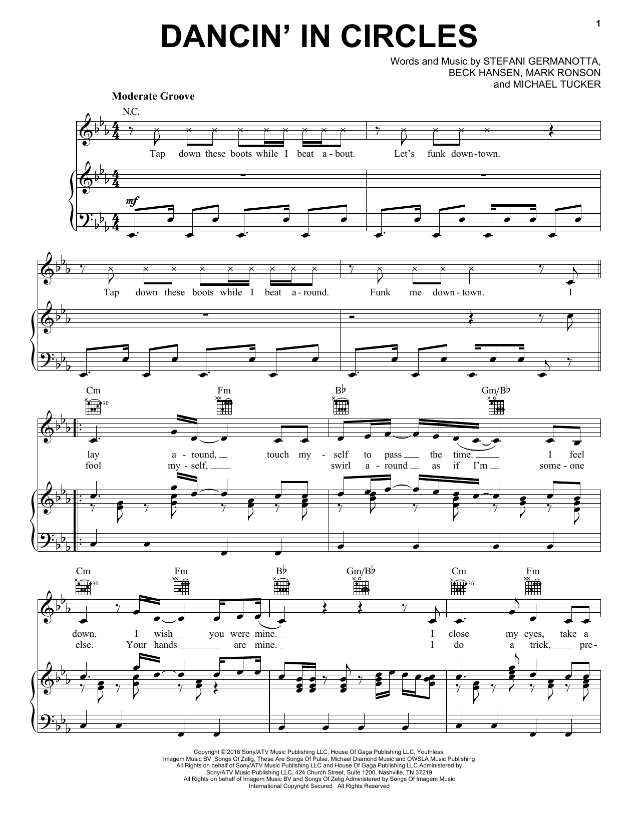 Download or print Lady Gaga Dancin' In Circles sheet music, chords and digital score arranged for Piano, Vocal & Guitar Chords (Right-Hand Melody). This Pop score includes 5 page(s).