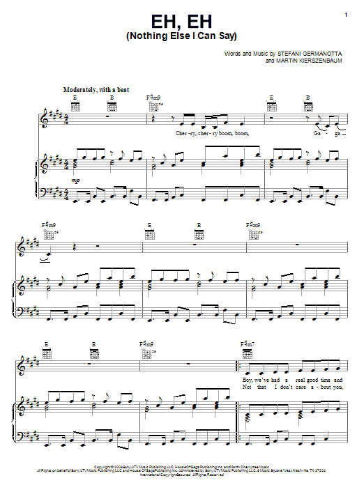 Download or print Lady Gaga Eh, Eh (Nothing Else I Can Say) sheet music, chords and digital score arranged for Piano, Vocal & Guitar Chords (Right-Hand Melody). This Pop score includes 5 page(s).