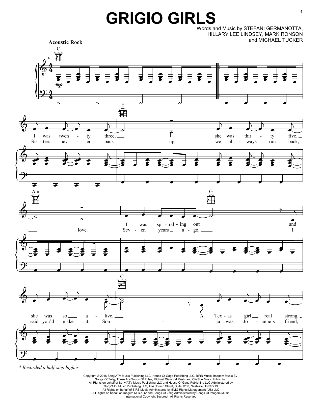 Download or print Lady Gaga Grigio Girls sheet music, chords and digital score arranged for Piano, Vocal & Guitar Chords (Right-Hand Melody). This Pop score includes 5 page(s).