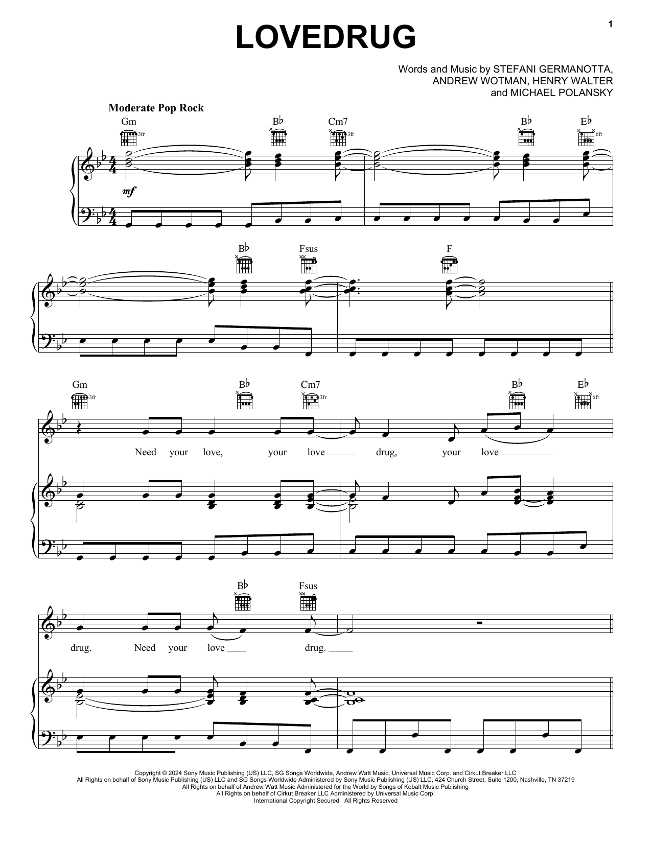 Download or print Lady Gaga LoveDrug sheet music, chords and digital score arranged for Piano, Vocal & Guitar Chords (Right-Hand Melody). This Pop score includes 6 page(s).