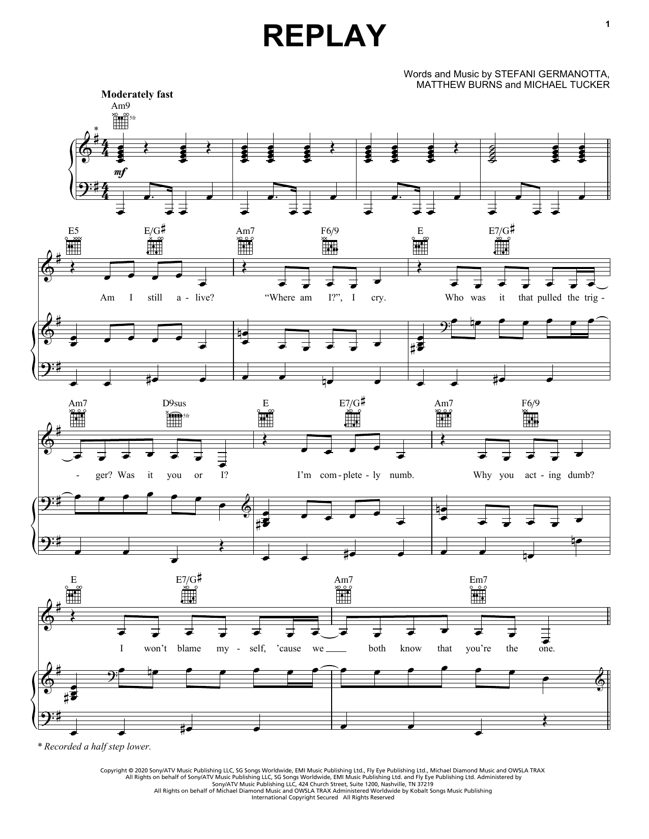 Download or print Lady Gaga Replay sheet music, chords and digital score arranged for Piano, Vocal & Guitar Chords (Right-Hand Melody). This Pop score includes 7 page(s).