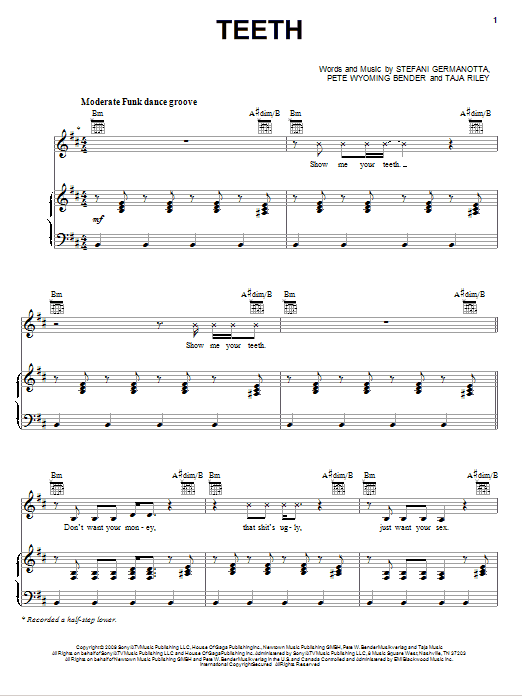 Download or print Lady Gaga Teeth sheet music, chords and digital score arranged for Piano, Vocal & Guitar Chords (Right-Hand Melody). This Pop score includes 9 page(s).
