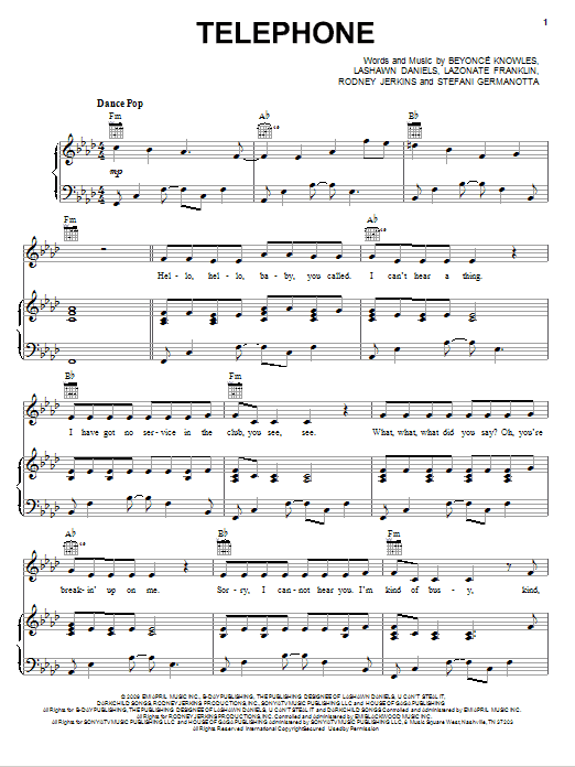 Download or print Lady Gaga Telephone sheet music, chords and digital score arranged for Easy Piano. This Pop score includes 6 page(s).