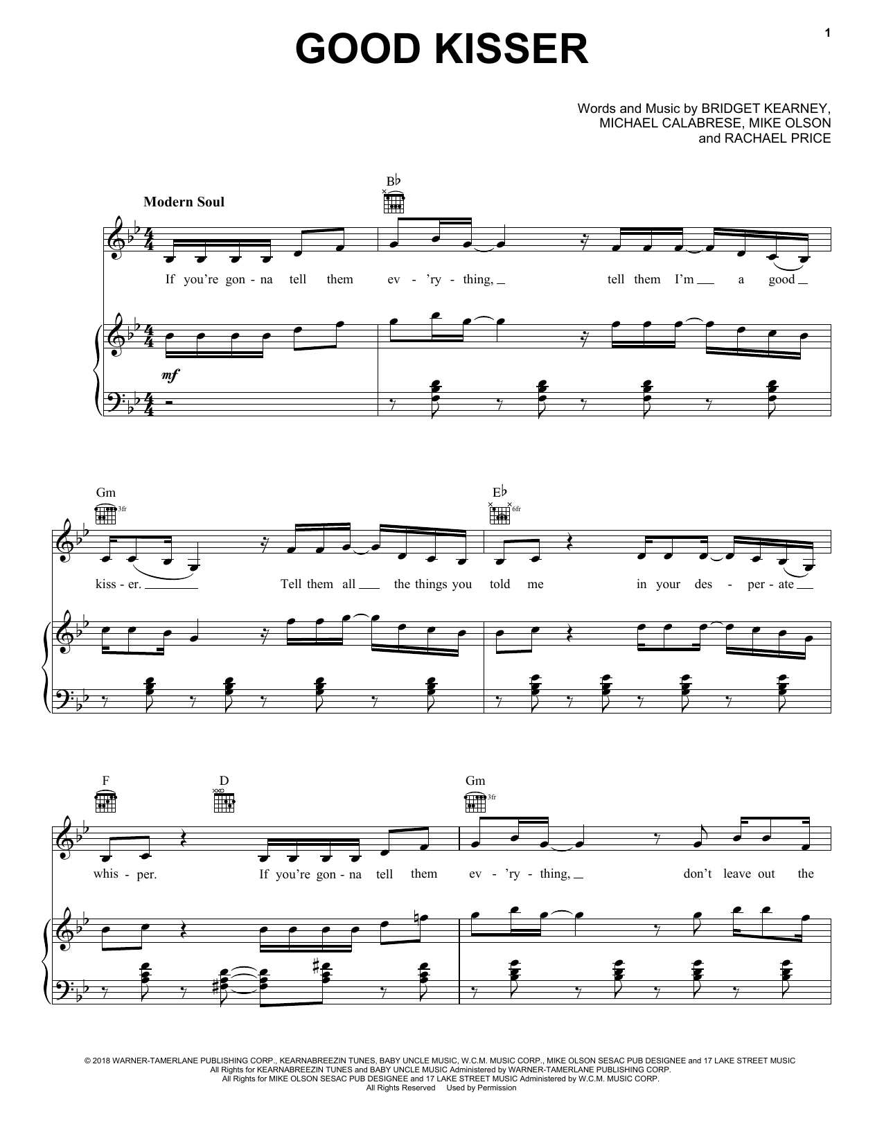 Download or print Lake Street Dive Good Kisser sheet music, chords and digital score arranged for Piano, Vocal & Guitar Chords (Right-Hand Melody). This Pop score includes 9 page(s).