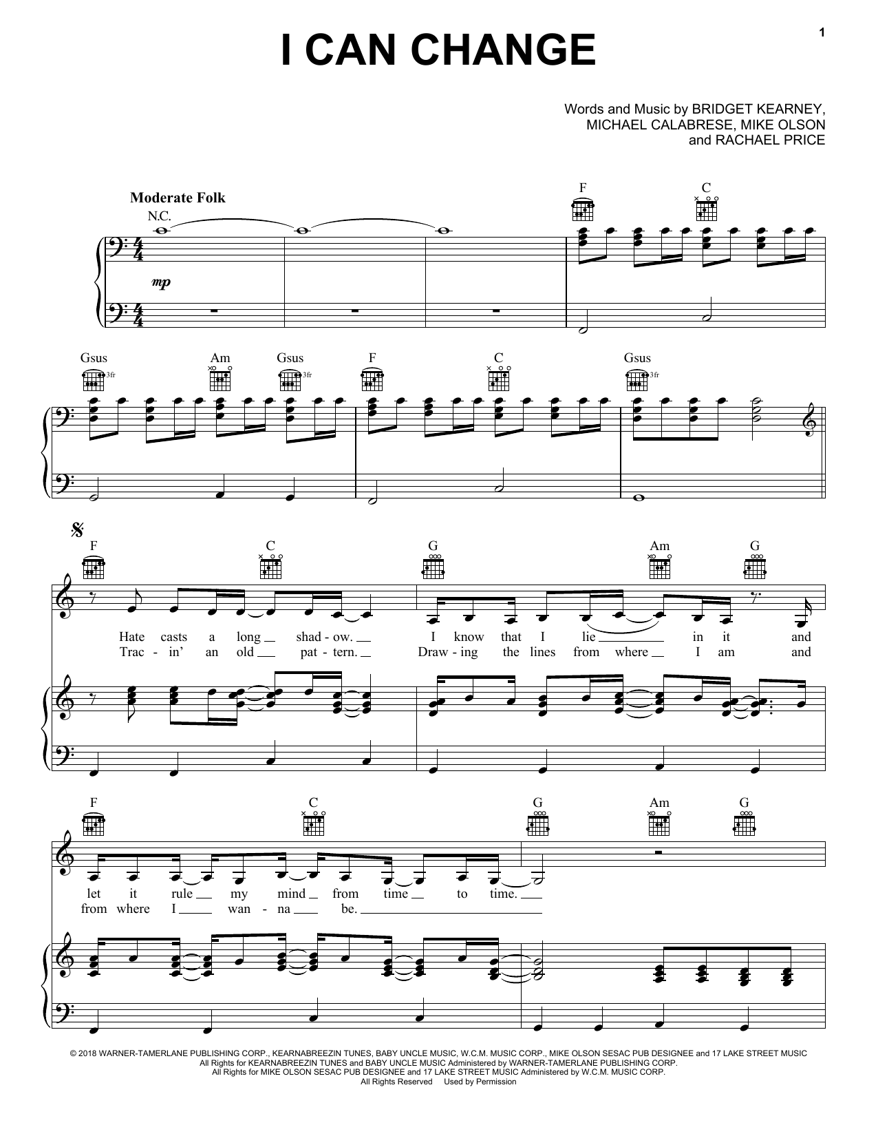 Download or print Lake Street Dive I Can Change sheet music, chords and digital score arranged for Piano, Vocal & Guitar Chords (Right-Hand Melody). This Pop score includes 3 page(s).