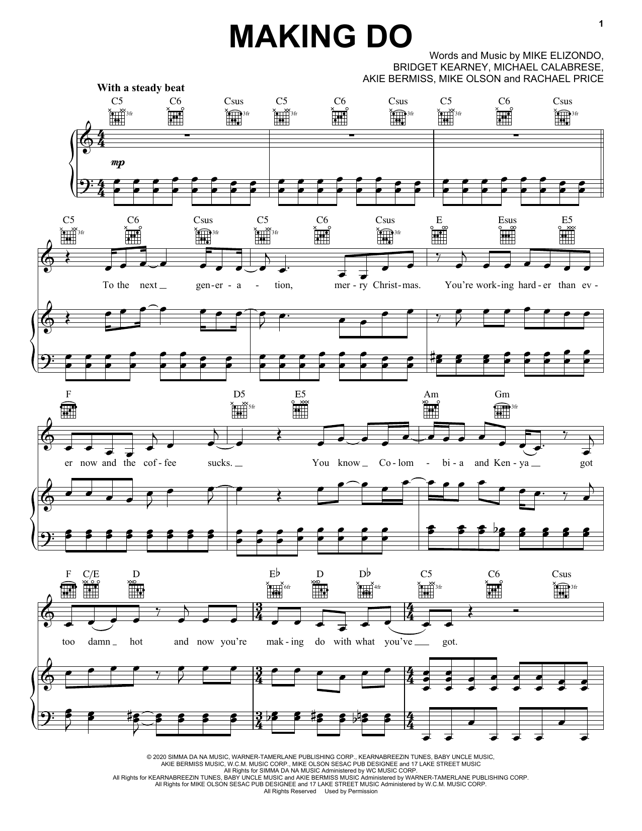 Download or print Lake Street Dive Making Do sheet music, chords and digital score arranged for Piano, Vocal & Guitar Chords (Right-Hand Melody). This Rock score includes 8 page(s).