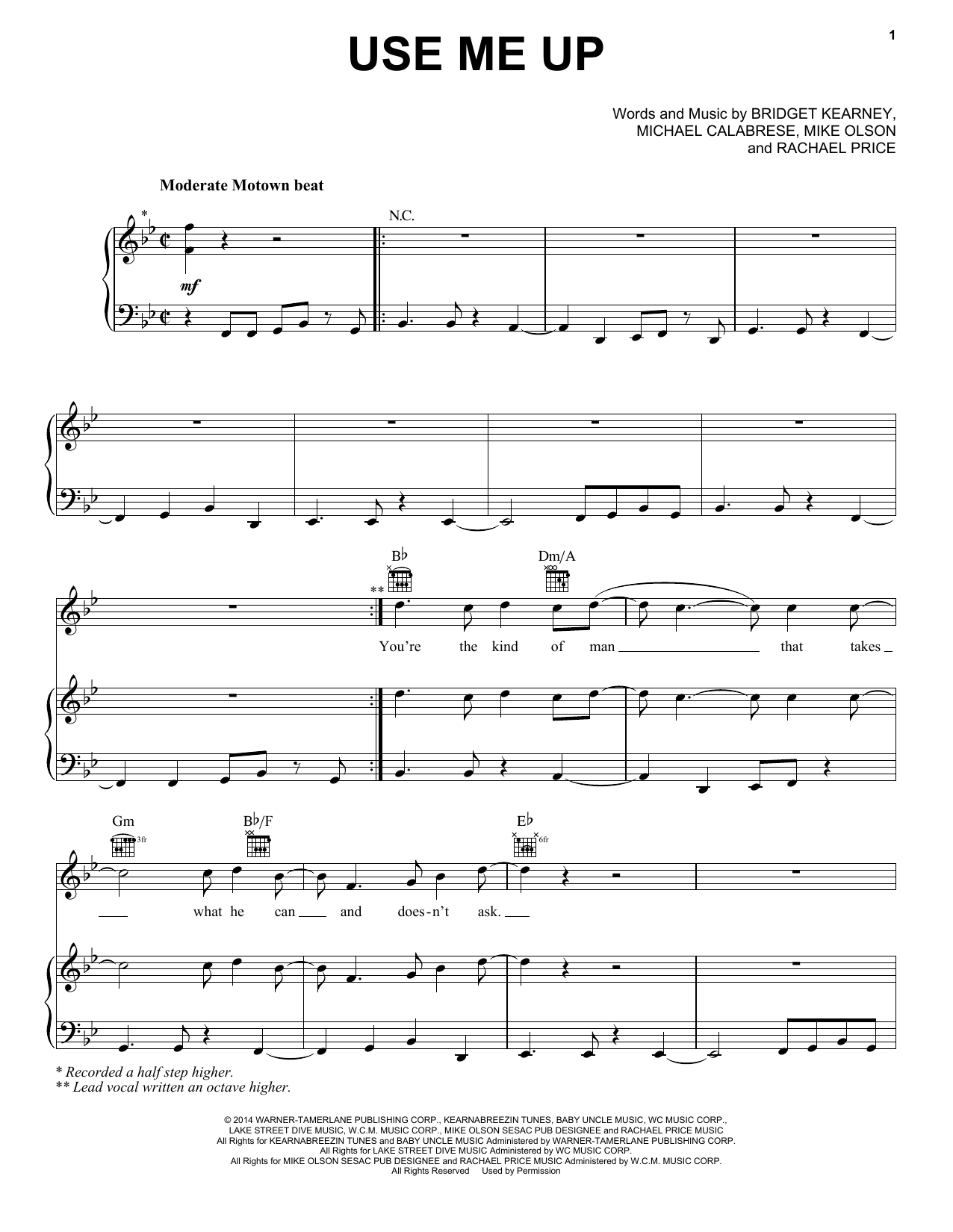 Download or print Lake Street Dive Use Me Up sheet music, chords and digital score arranged for Piano, Vocal & Guitar Chords (Right-Hand Melody). This Pop score includes 10 page(s).