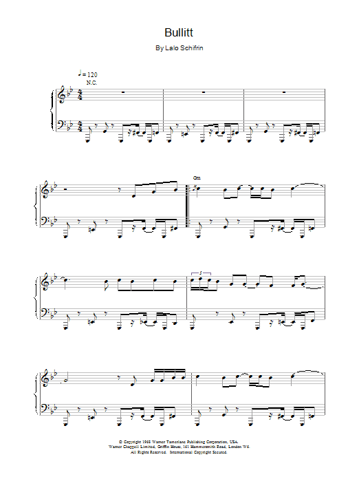 Download or print Lalo Schifrin Bullitt sheet music, chords and digital score arranged for Piano Solo. This Film/TV score includes 2 page(s).