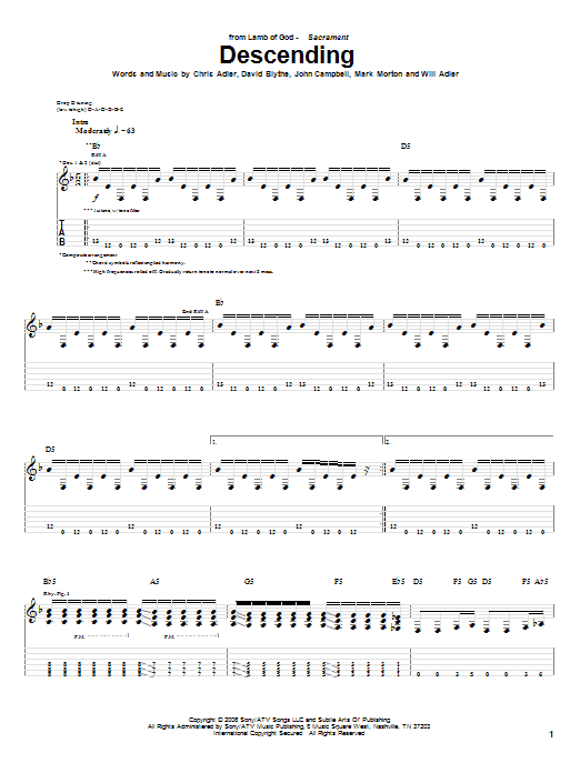 Download or print Lamb Of God Descending sheet music, chords and digital score arranged for Guitar Tab. This Metal score includes 7 page(s).