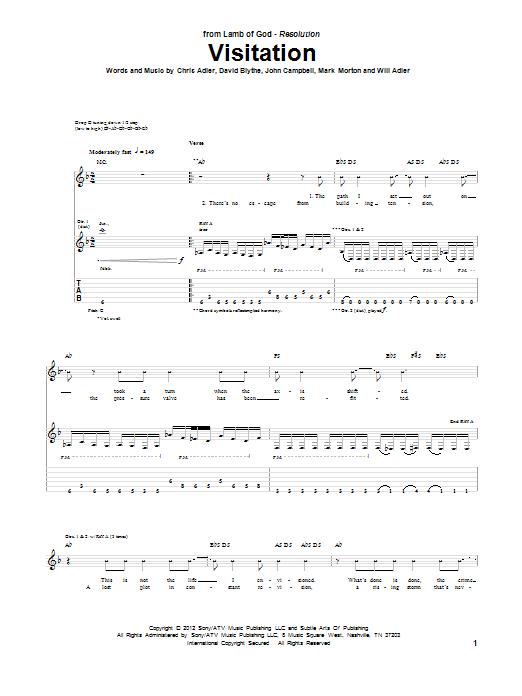 Download or print Lamb Of God Visitation sheet music, chords and digital score arranged for Guitar Tab. This Pop score includes 9 page(s).