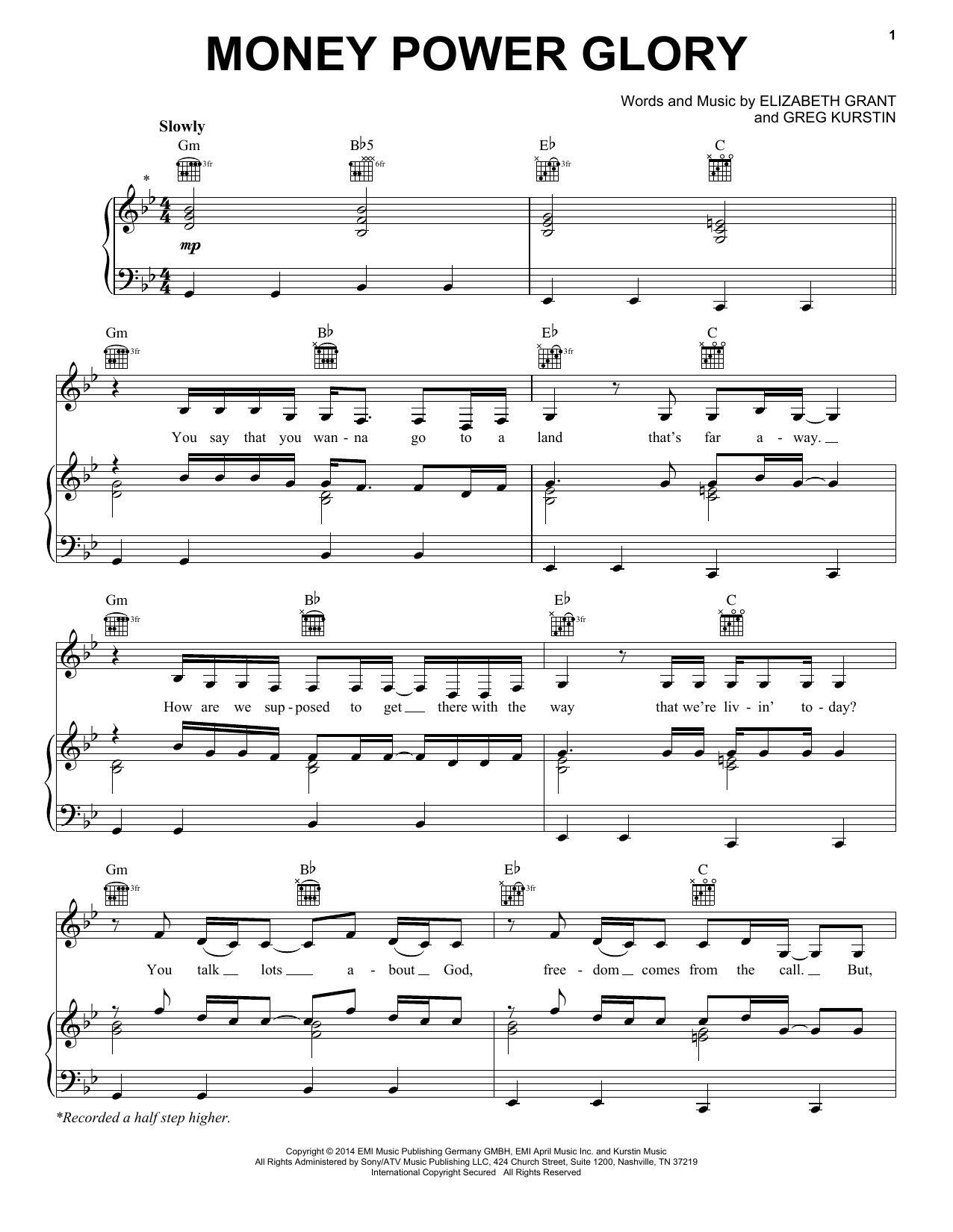 Download or print Lana Del Rey Money Power Glory sheet music, chords and digital score arranged for Piano, Vocal & Guitar Chords (Right-Hand Melody). This Pop score includes 6 page(s).
