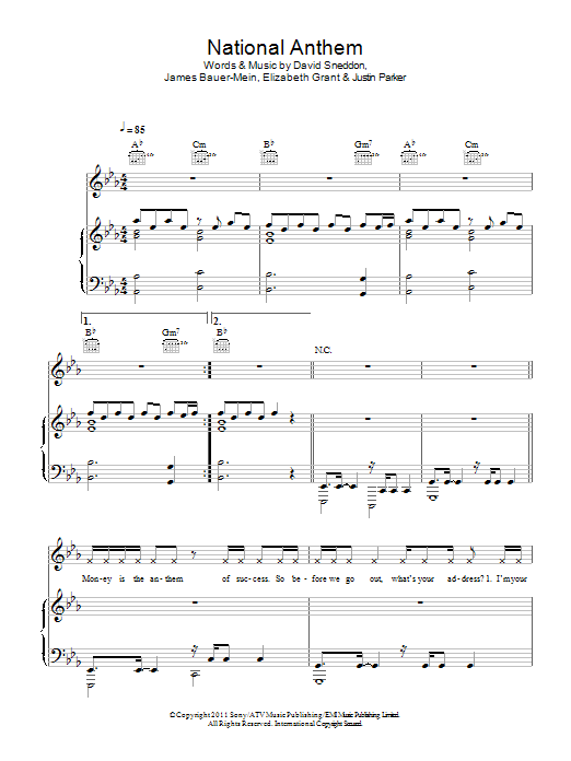 Download or print Lana Del Rey National Anthem sheet music, chords and digital score arranged for Piano, Vocal & Guitar Chords. This Alternative score includes 9 page(s).