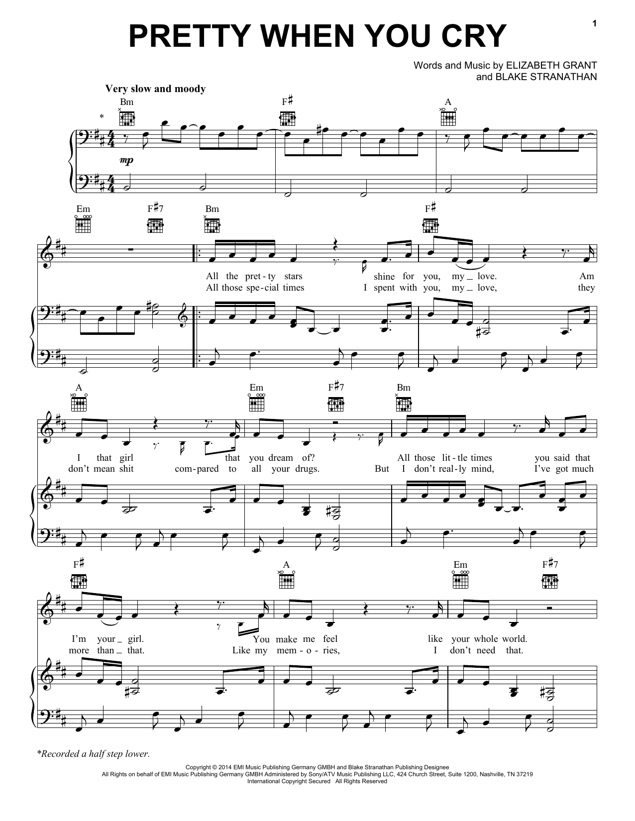Download or print Lana Del Rey Pretty When You Cry sheet music, chords and digital score arranged for Piano, Vocal & Guitar Chords (Right-Hand Melody). This Pop score includes 4 page(s).