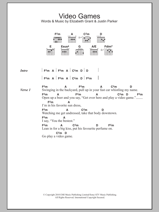 Download or print Lana Del Rey Video Games sheet music, chords and digital score arranged for Guitar Chords/Lyrics. This Pop score includes 3 page(s).