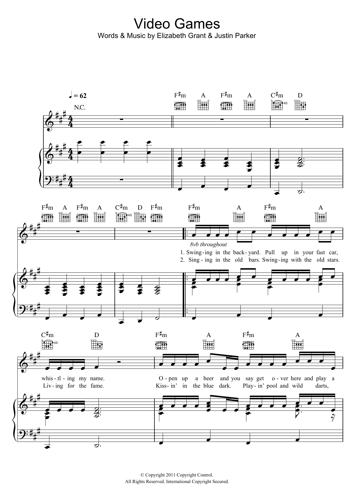 Download or print Lana Del Rey Video Games sheet music, chords and digital score arranged for Beginner Piano (Abridged). This Pop score includes 2 page(s).