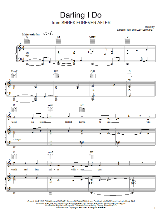 Download or print Landon Pigg & Lucy Schwartz Darling I Do sheet music, chords and digital score arranged for Piano, Vocal & Guitar Chords (Right-Hand Melody). This Film/TV score includes 6 page(s).