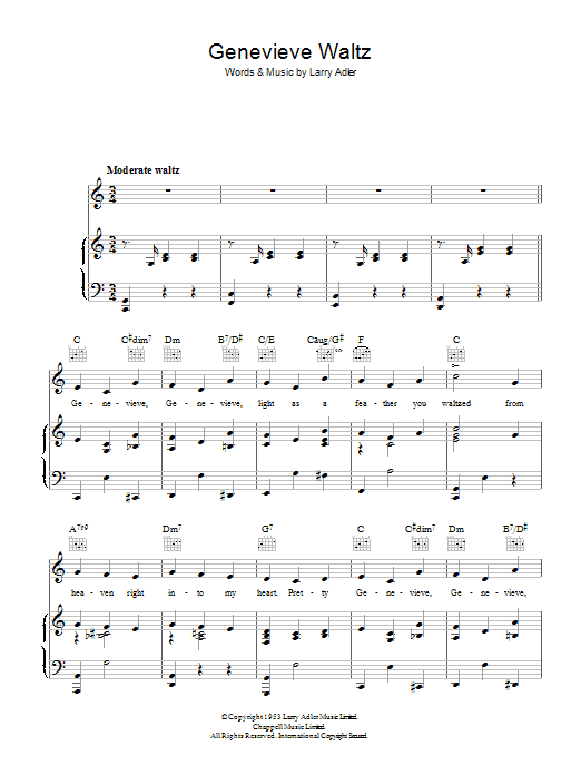 Download or print Larry Adler Genevieve Waltz sheet music, chords and digital score arranged for Piano, Vocal & Guitar Chords. This Pop score includes 4 page(s).