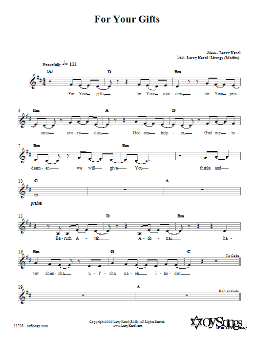 Download or print Larry Karol For Your Gifts sheet music, chords and digital score arranged for Lead Sheet / Fake Book. This Traditional score includes 2 page(s).