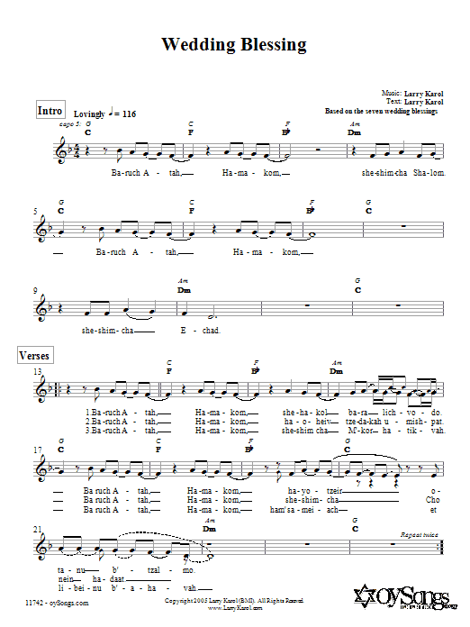 Download or print Larry Karol Wedding Blessing sheet music, chords and digital score arranged for Lead Sheet / Fake Book. This Traditional score includes 3 page(s).